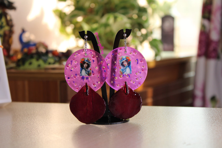 این گوشواره صدفی با گلبرگ گل رز ترکیب بسیار زیبایی بوجود آورده و از سنگ ریزه ها و رنگ های رزینی برای جلوه بیشتر اون استفاده و کل گوشواره رزینی شده